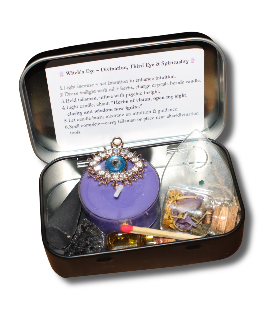 Psychic power to-go. With intuition herbs, oil, crystals, incense, talisman, and rune, this kit tunes your third eye on the fly.